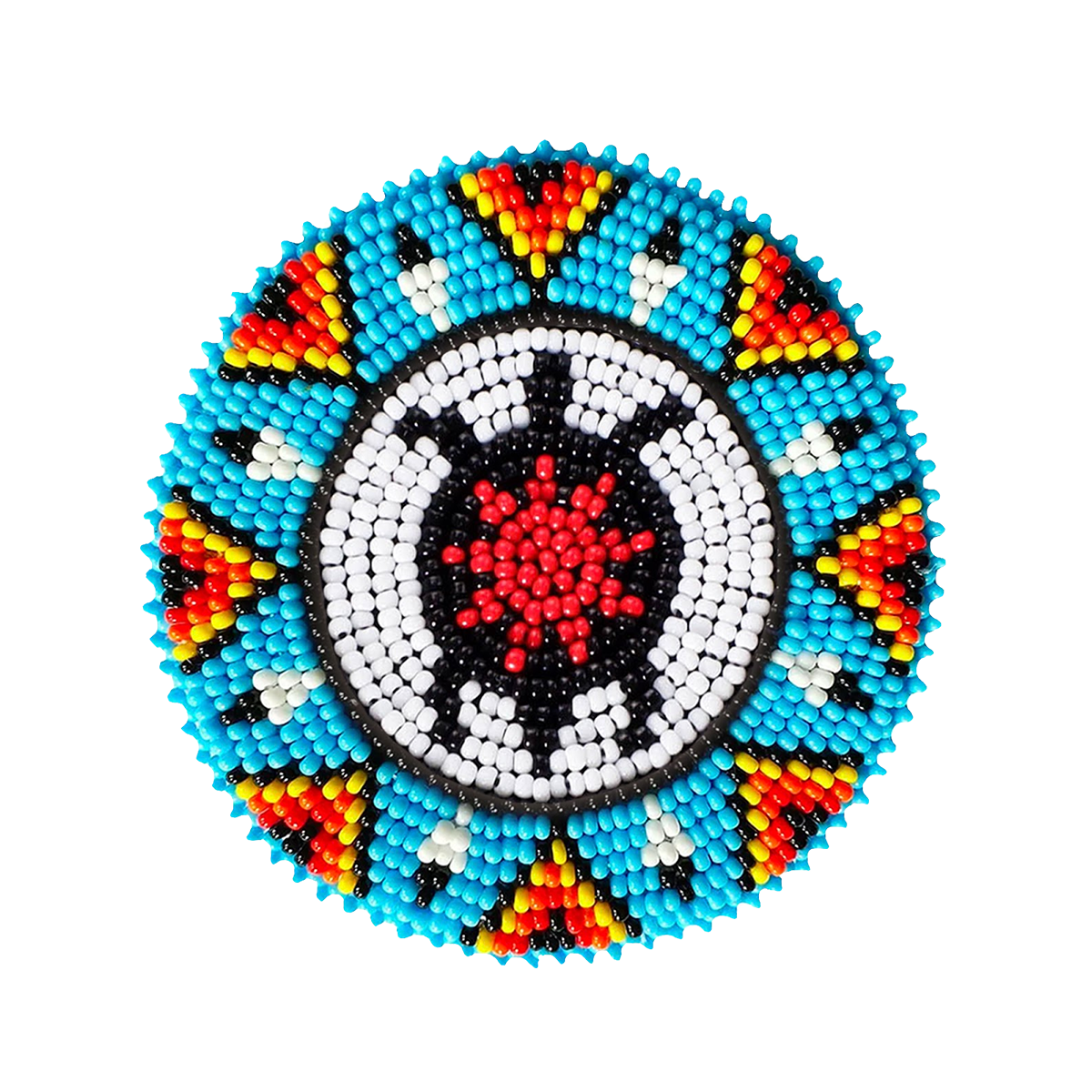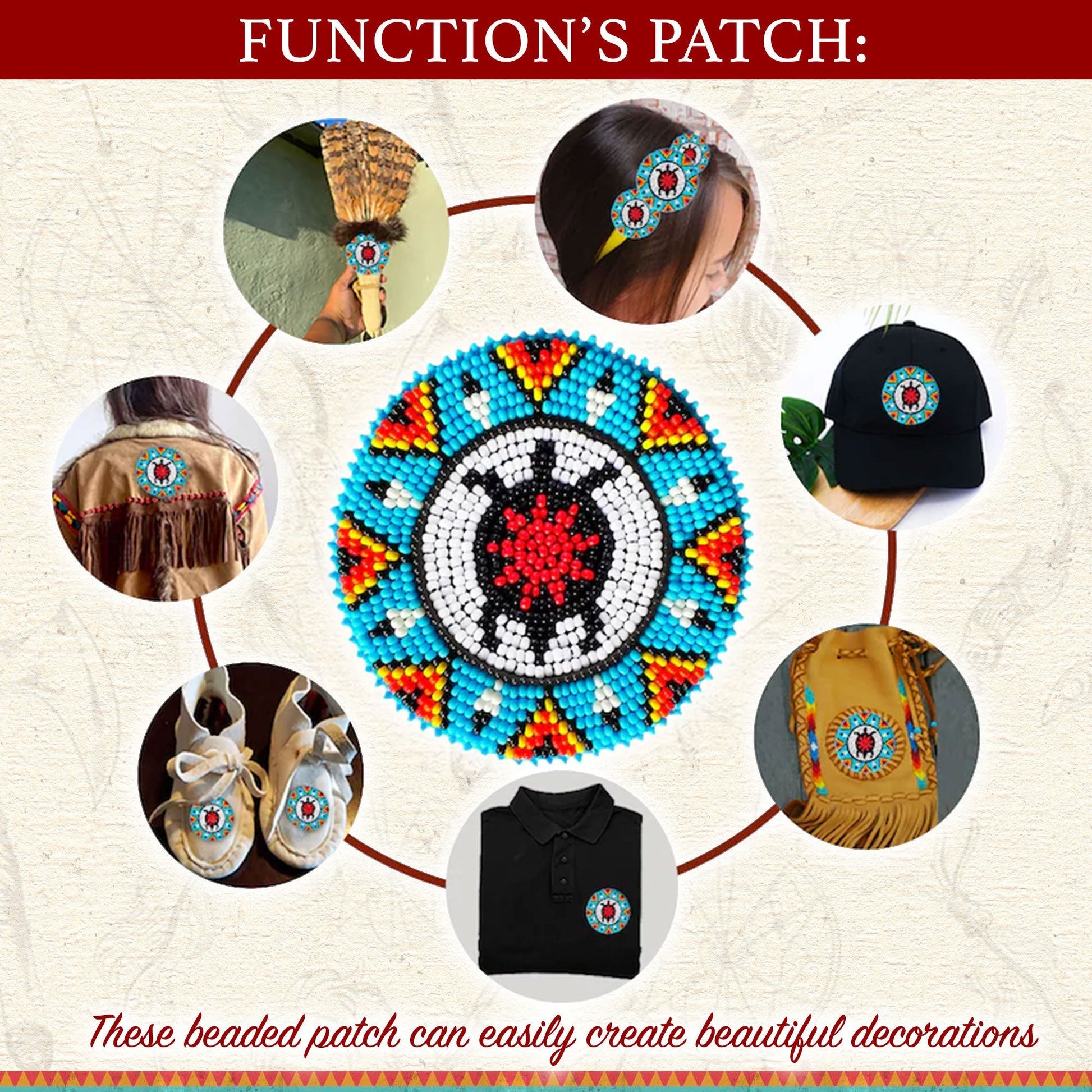 This beaded patch, inspired by Native American design motifs, showcases a harmonious blend of vibrant colors and intricate patterns. The rich tones and bold primary hues pay homage to the natural landscapes that have shaped the lives and spirituality of indigenous communities.