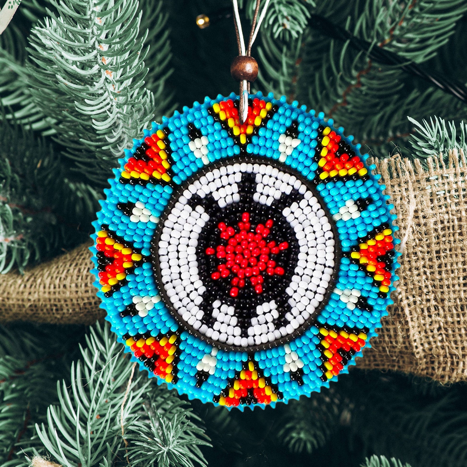 The beads, carefully chosen for their brilliance and symbolism, are meticulously hand-stitched to form an intricate geometric pattern that holds deep spiritual significance.