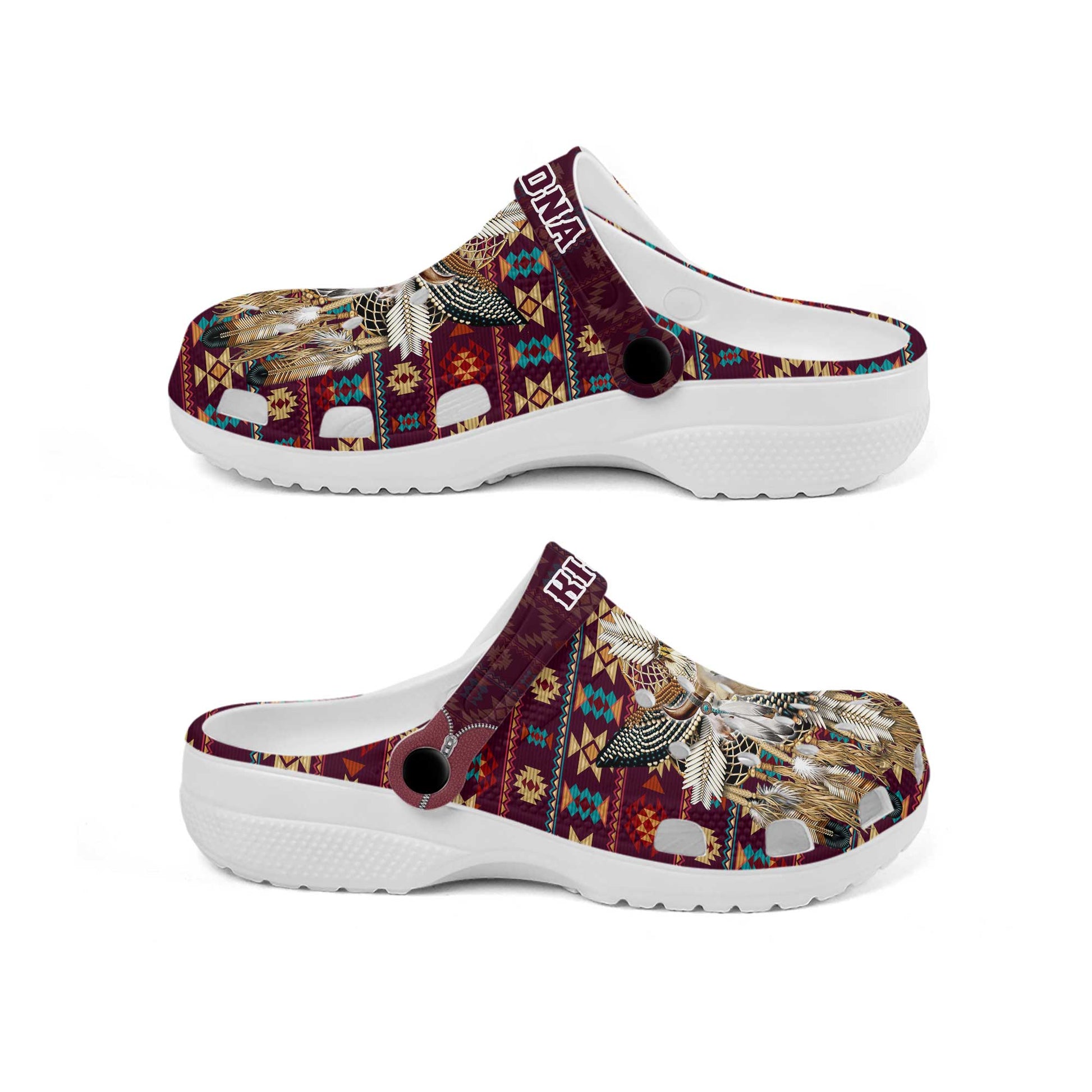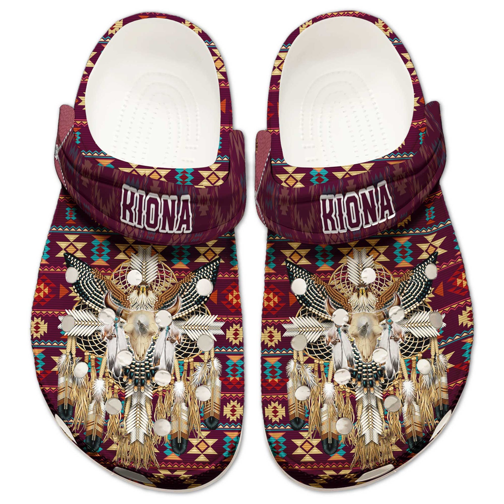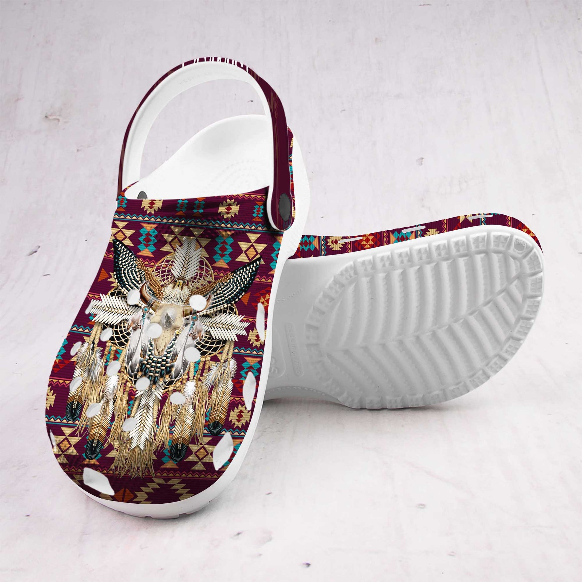 Custom Name Native Bull Skull Clogs – Tribal Dreamcatcher Shoes, Unique Family Gift