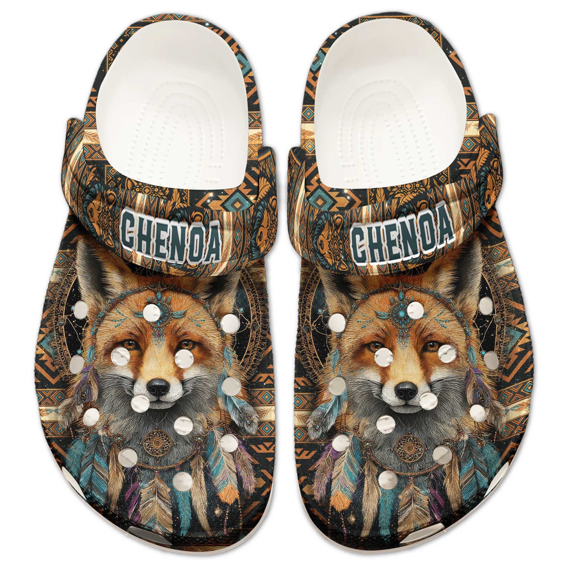 Custom Name Native Fox Spirit Clogs – Tribal Pattern, Feather Design & Family Gift
