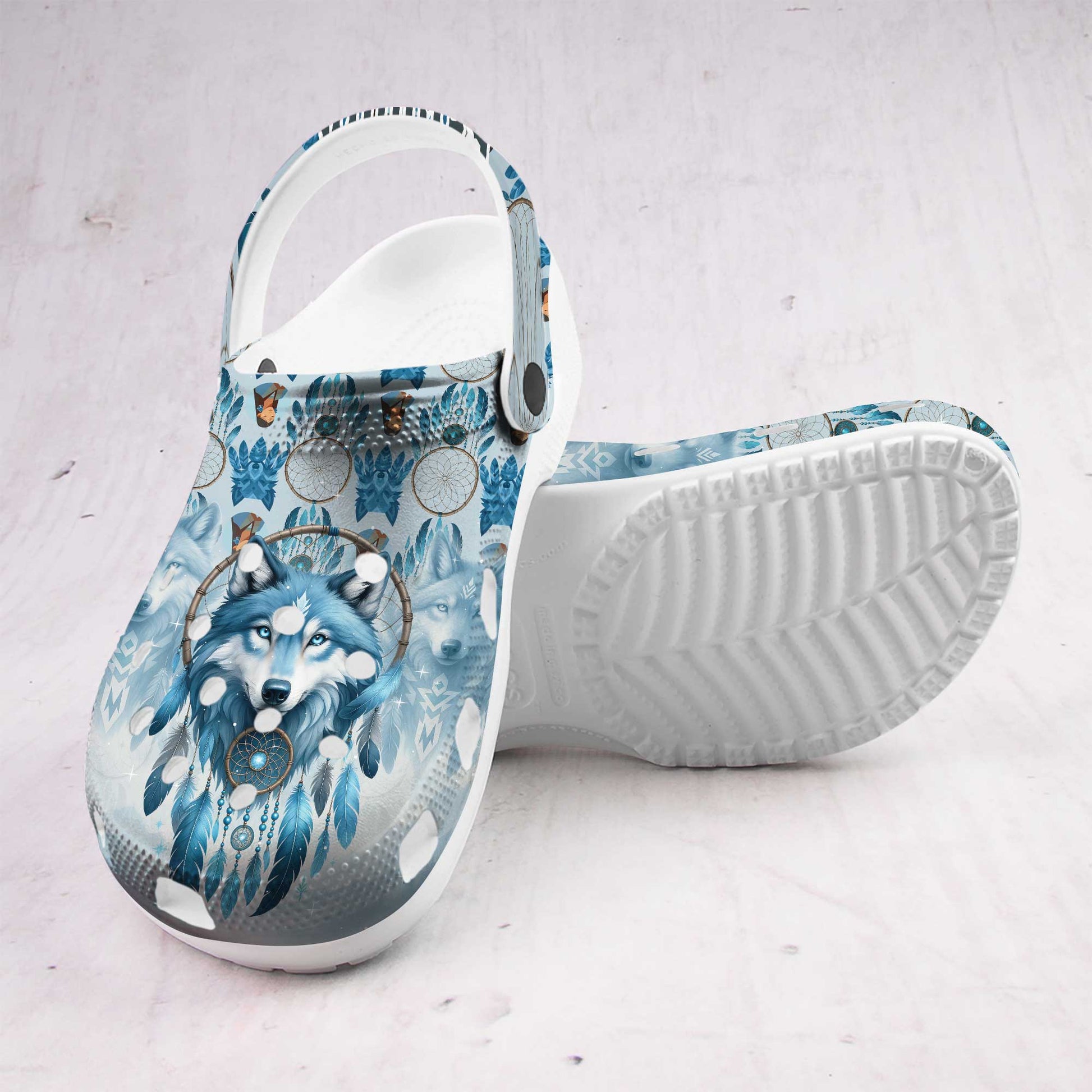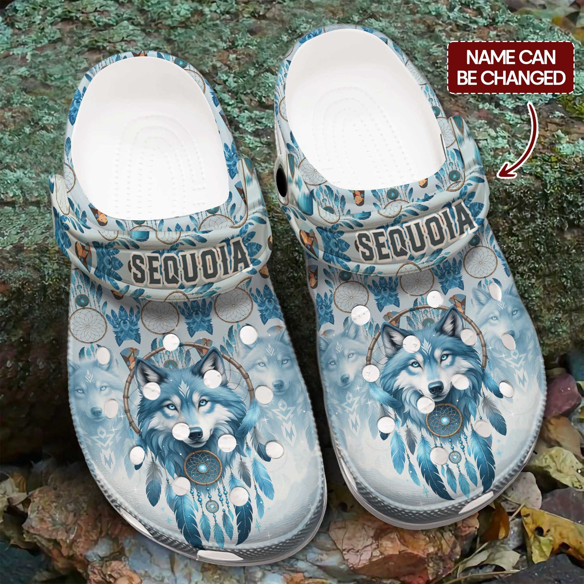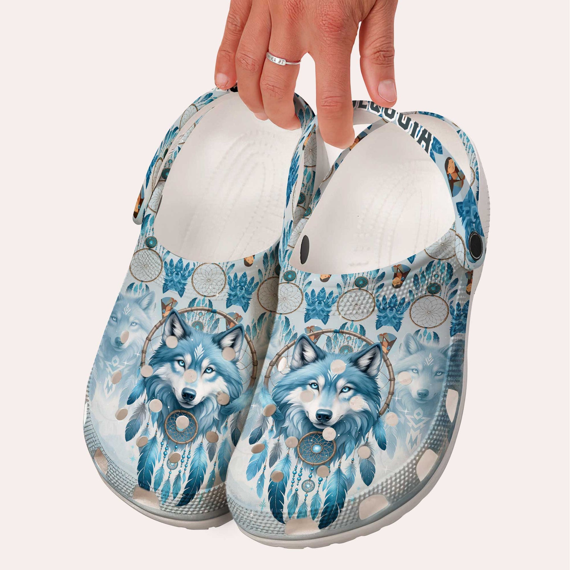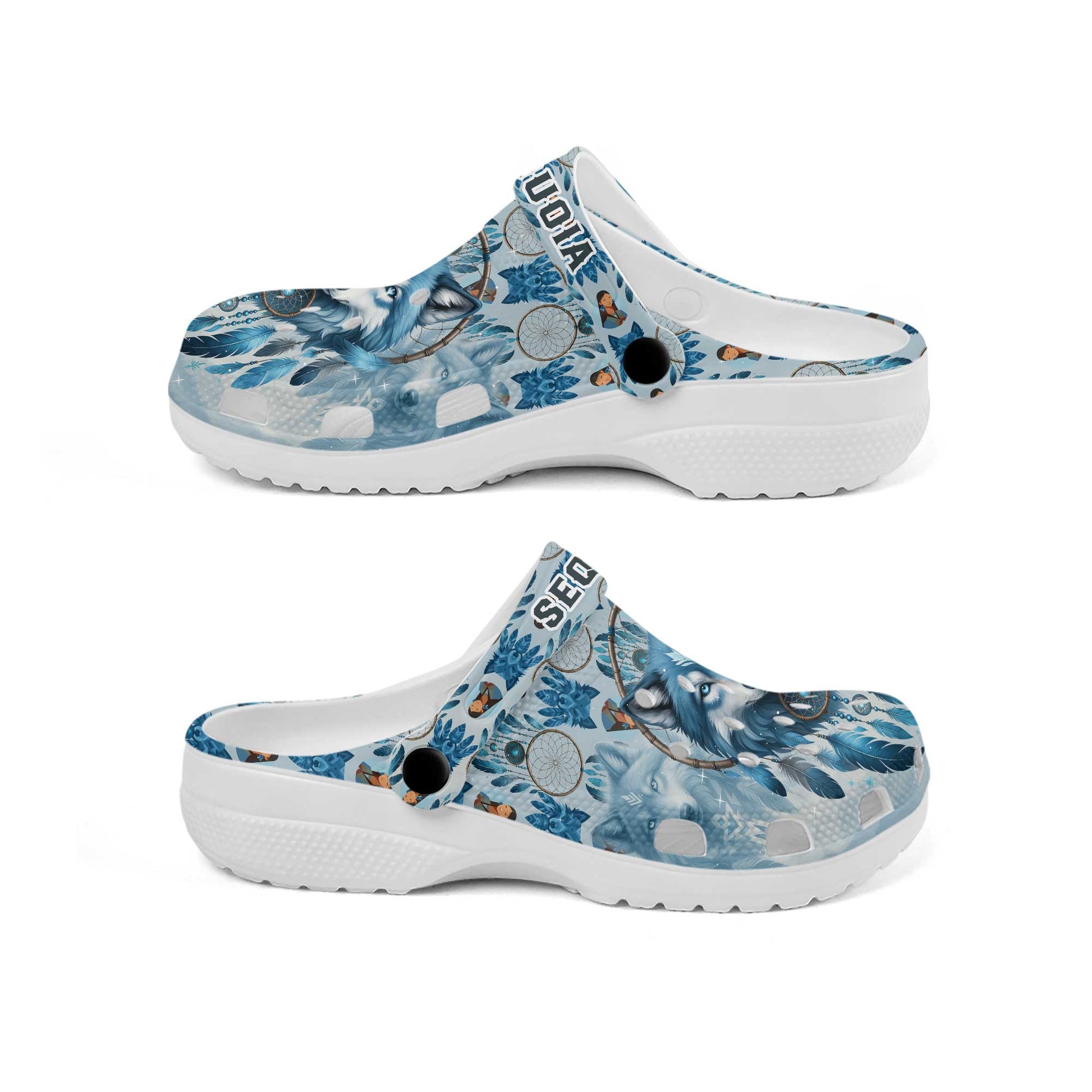 Custom Name Wolf Dreamcatcher Clogs – Tribal Spirit & Personalized Native Gift