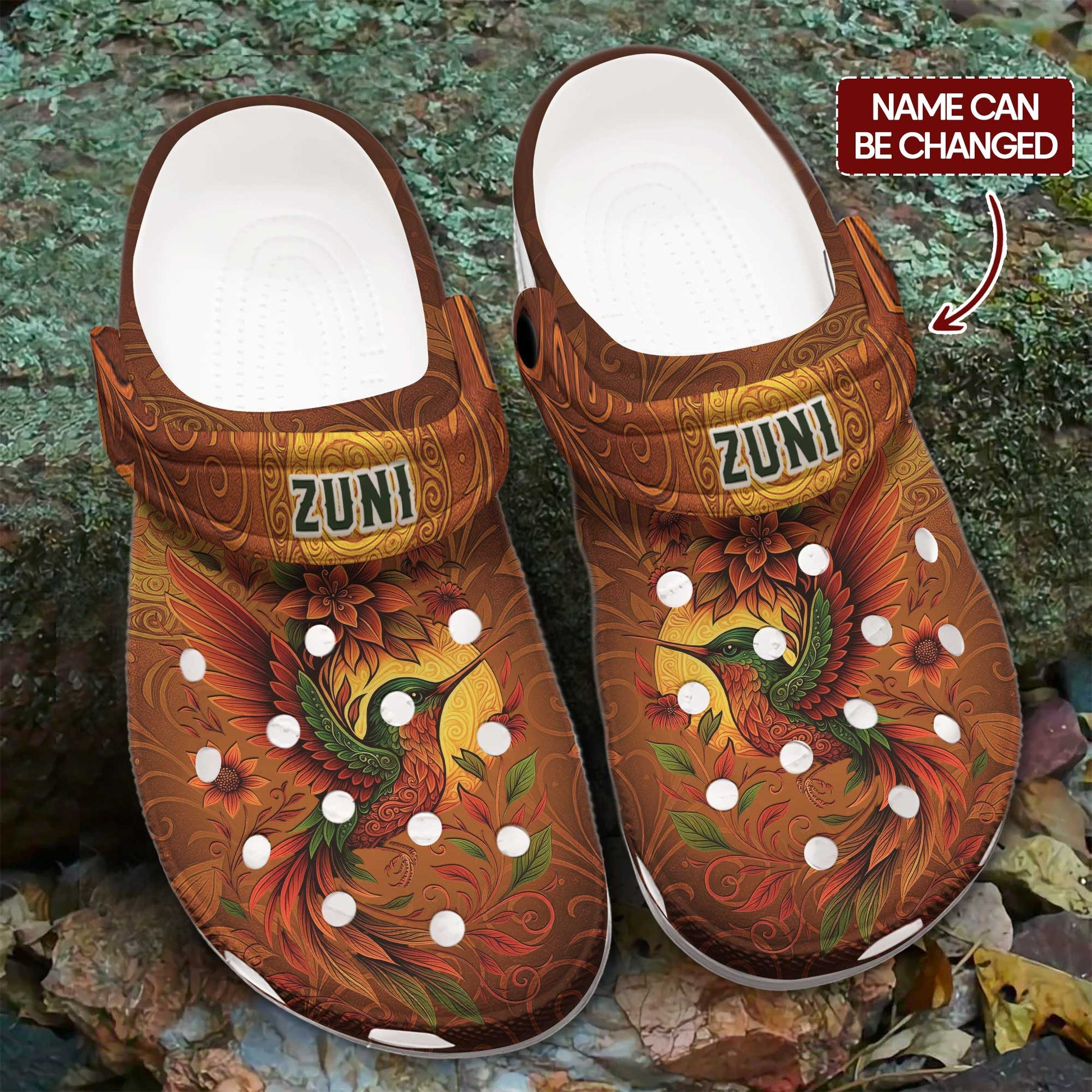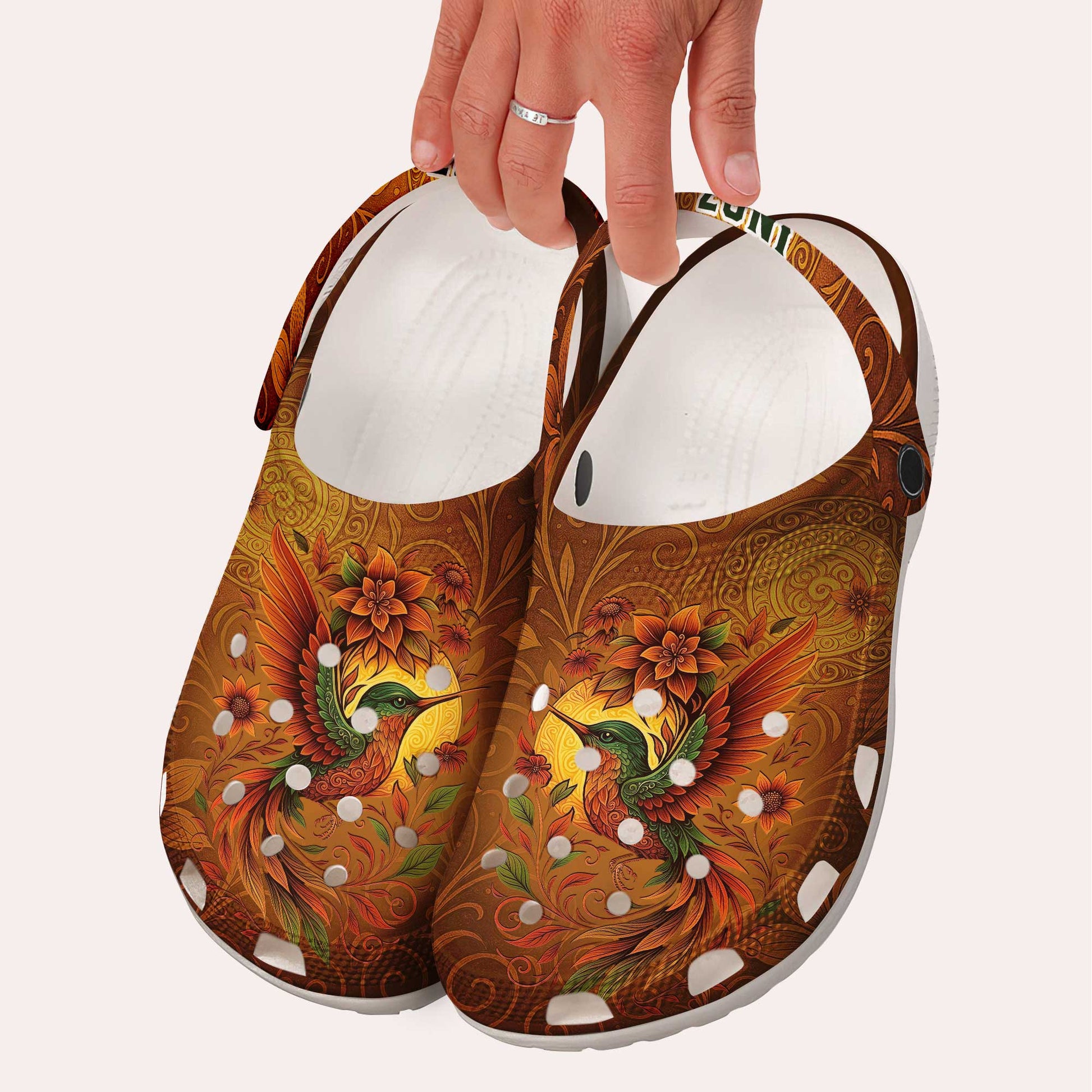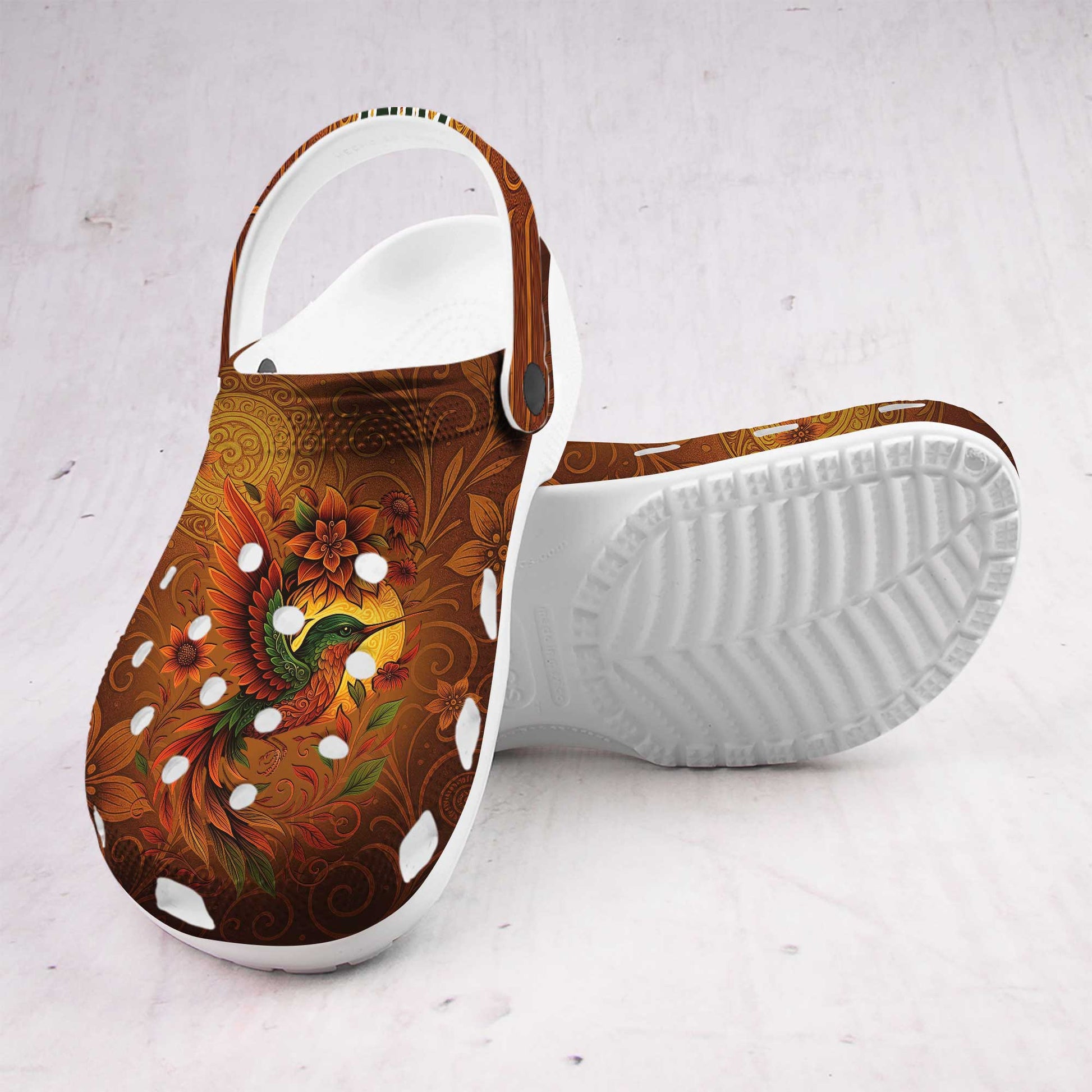 Custom Name Clogs – Vibrant Bird, Sunflower Bloom & Autumn Swirl Details in Warm Tones