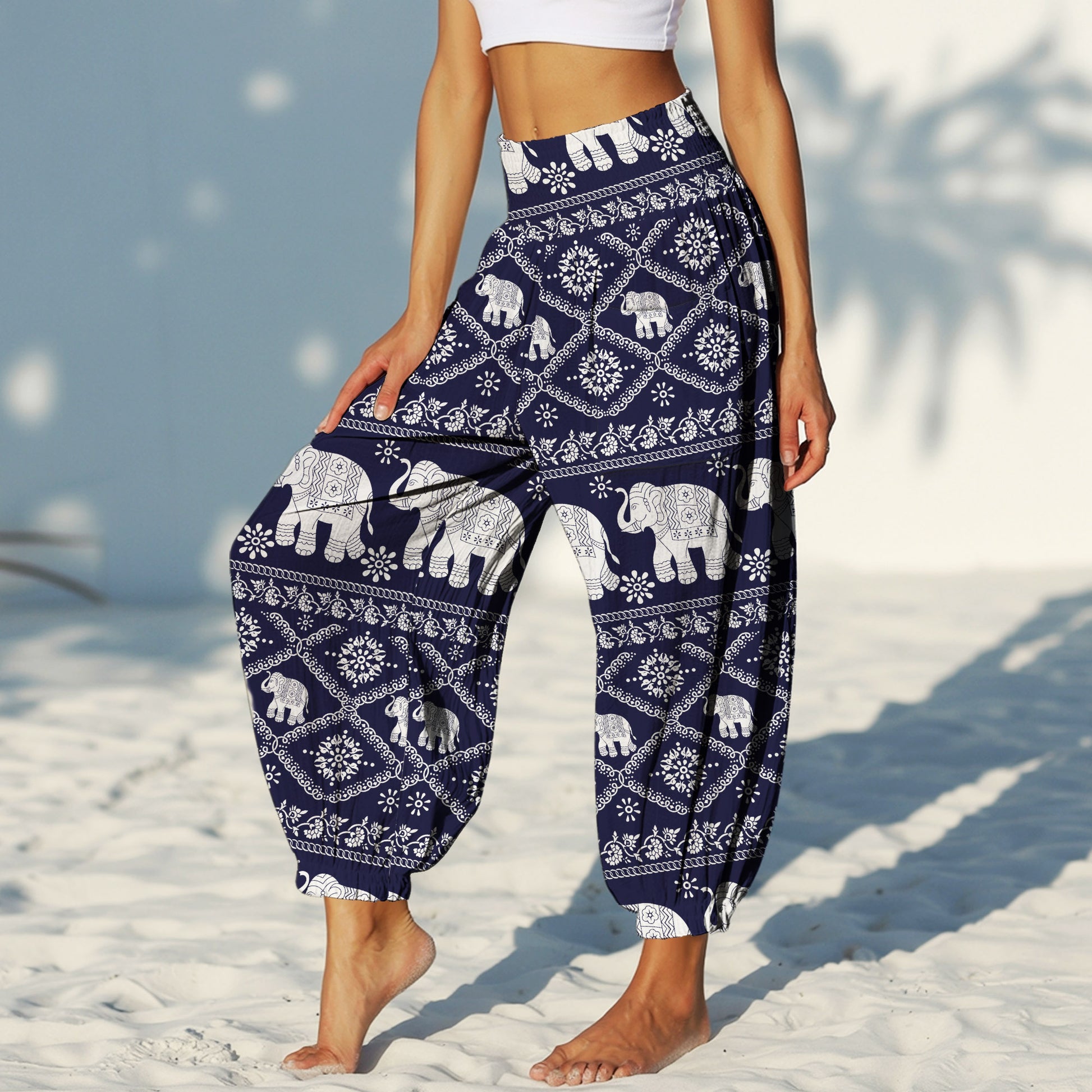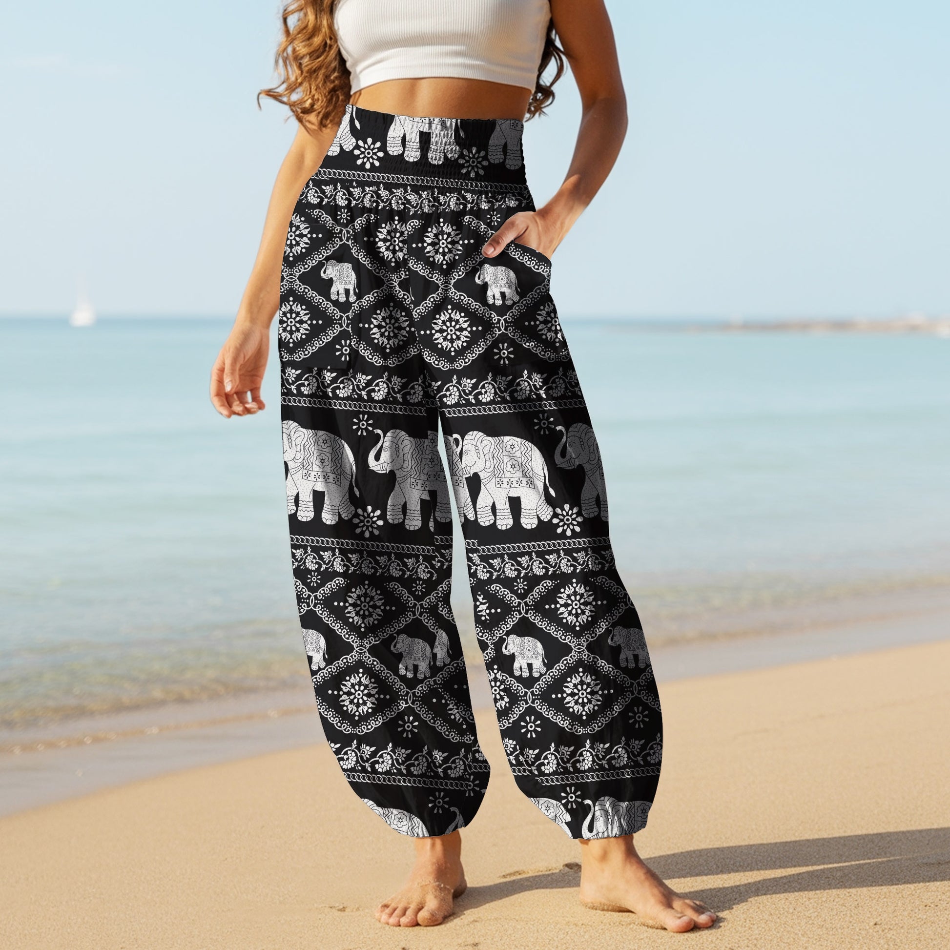 Black Elephant Print Harem Pants – Boho Yoga Pants with Pockets 05