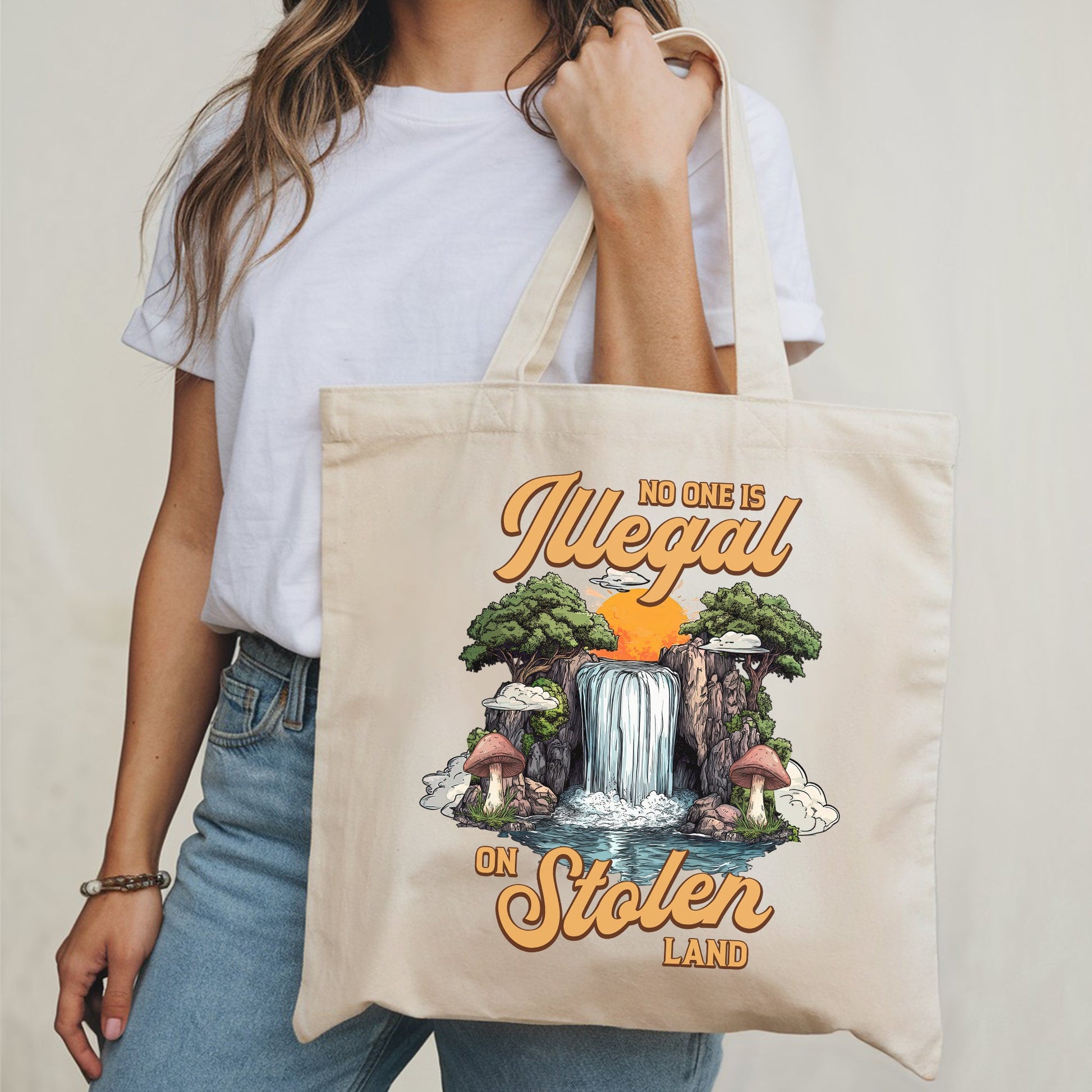 Show your support for a powerful message with our "No One Is Illegal On Stolen Land" tote bag. This vibrant and durable bag features a beautiful design with a colorful bird and floral patterns, making it a statement piece that also promotes unity and awareness for Native lands.