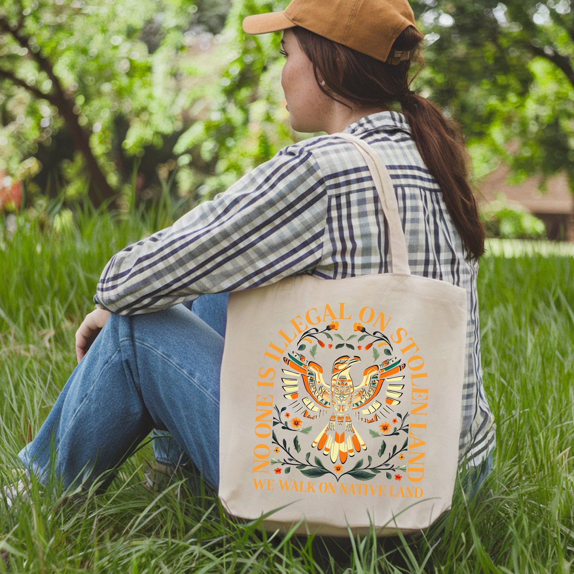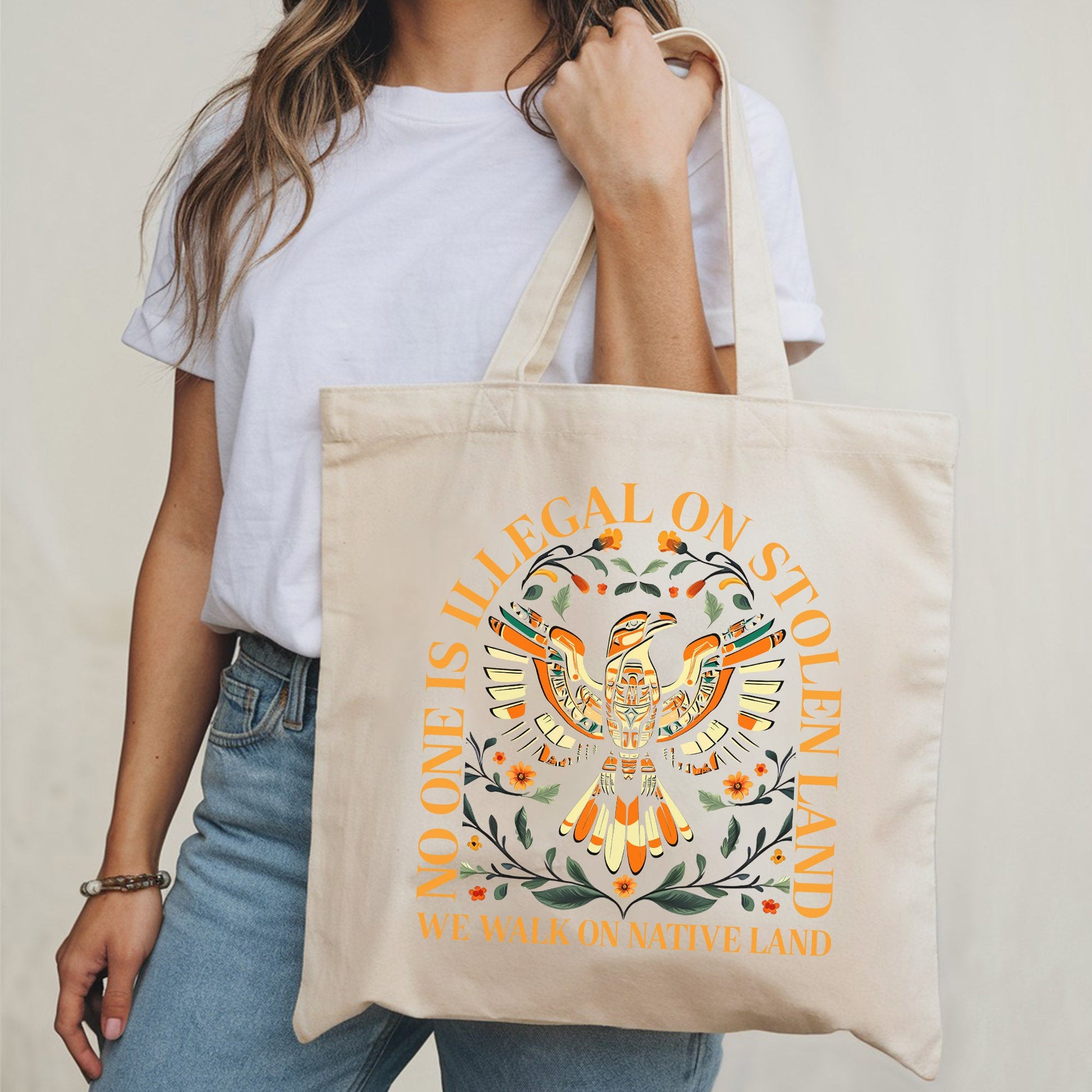 Show your support for a powerful message with our "No One Is Illegal On Stolen Land" tote bag. This vibrant and durable bag features a beautiful design with a colorful bird and floral patterns, making it a statement piece that also promotes unity and awareness for Native lands.
