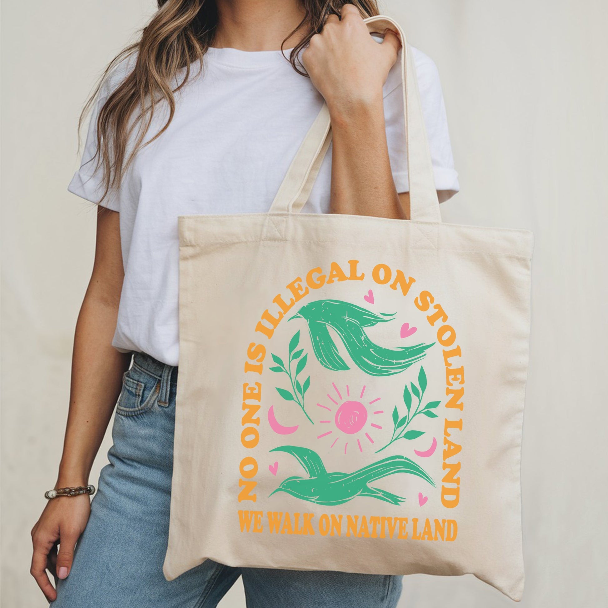 Show your support for a powerful message with our "No One Is Illegal On Stolen Land" tote bag. This vibrant and durable bag features a beautiful design with a colorful bird and floral patterns, making it a statement piece that also promotes unity and awareness for Native lands.