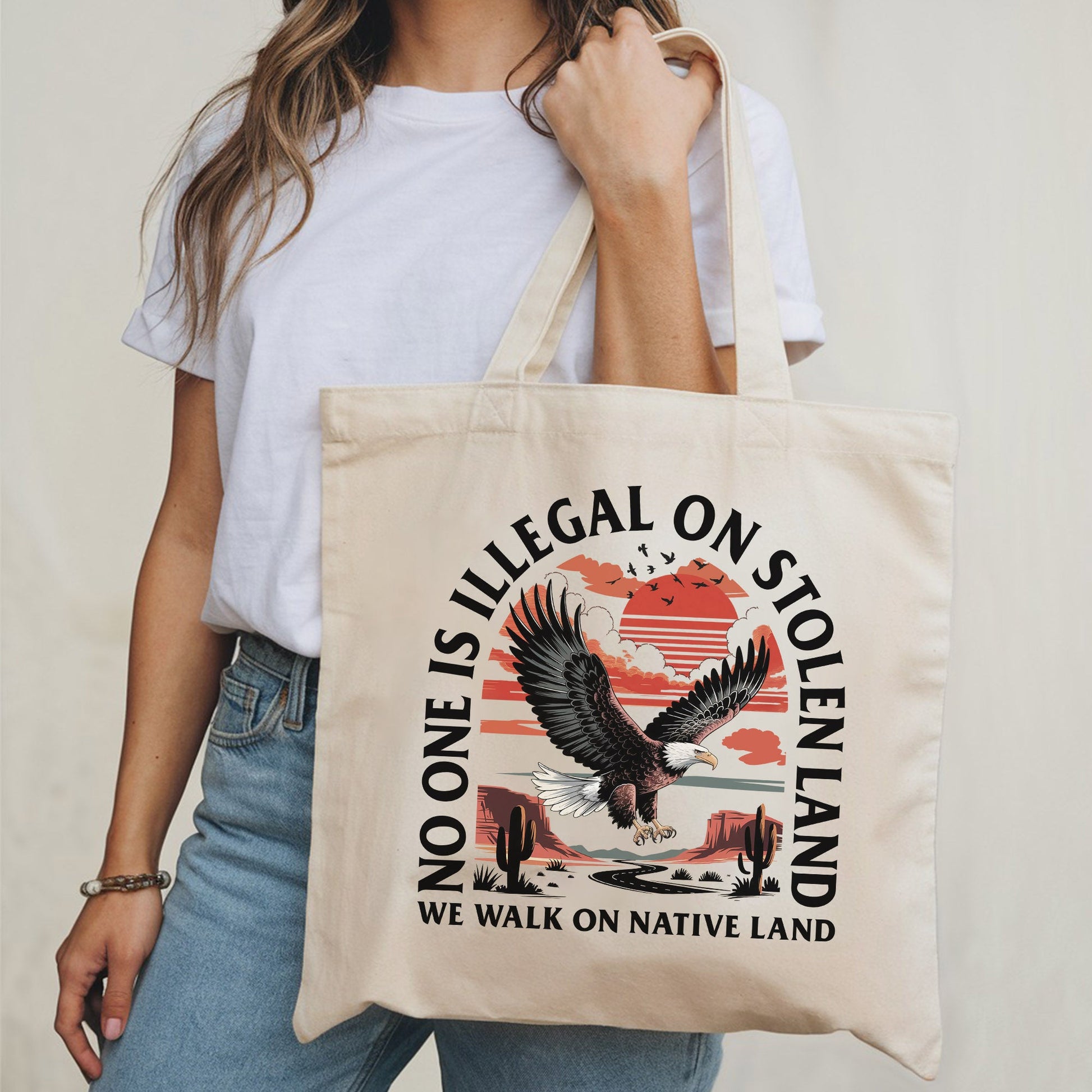 Show your support for a powerful message with our "No One Is Illegal On Stolen Land" tote bag. This vibrant and durable bag features a beautiful design with a colorful bird and floral patterns, making it a statement piece that also promotes unity and awareness for Native lands.