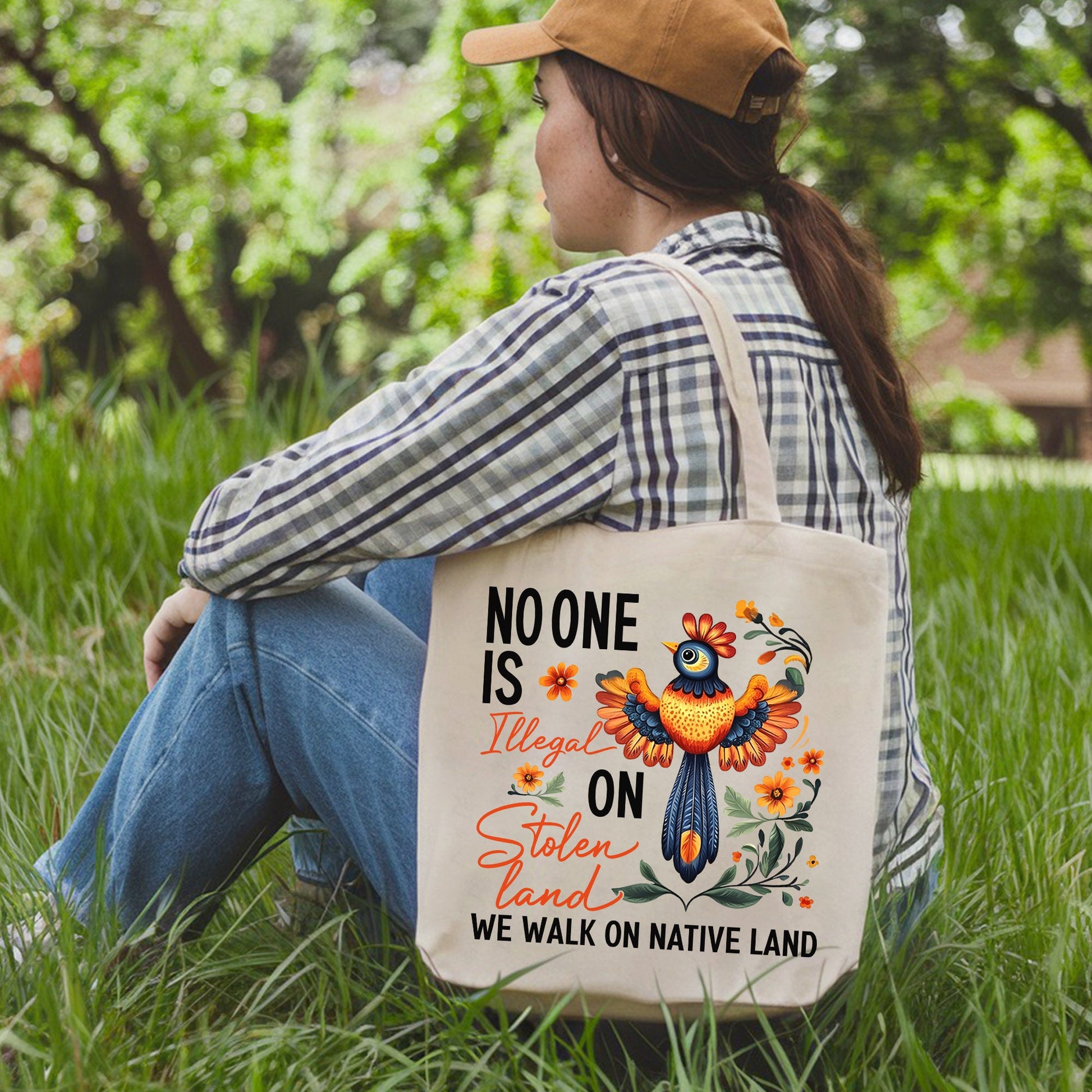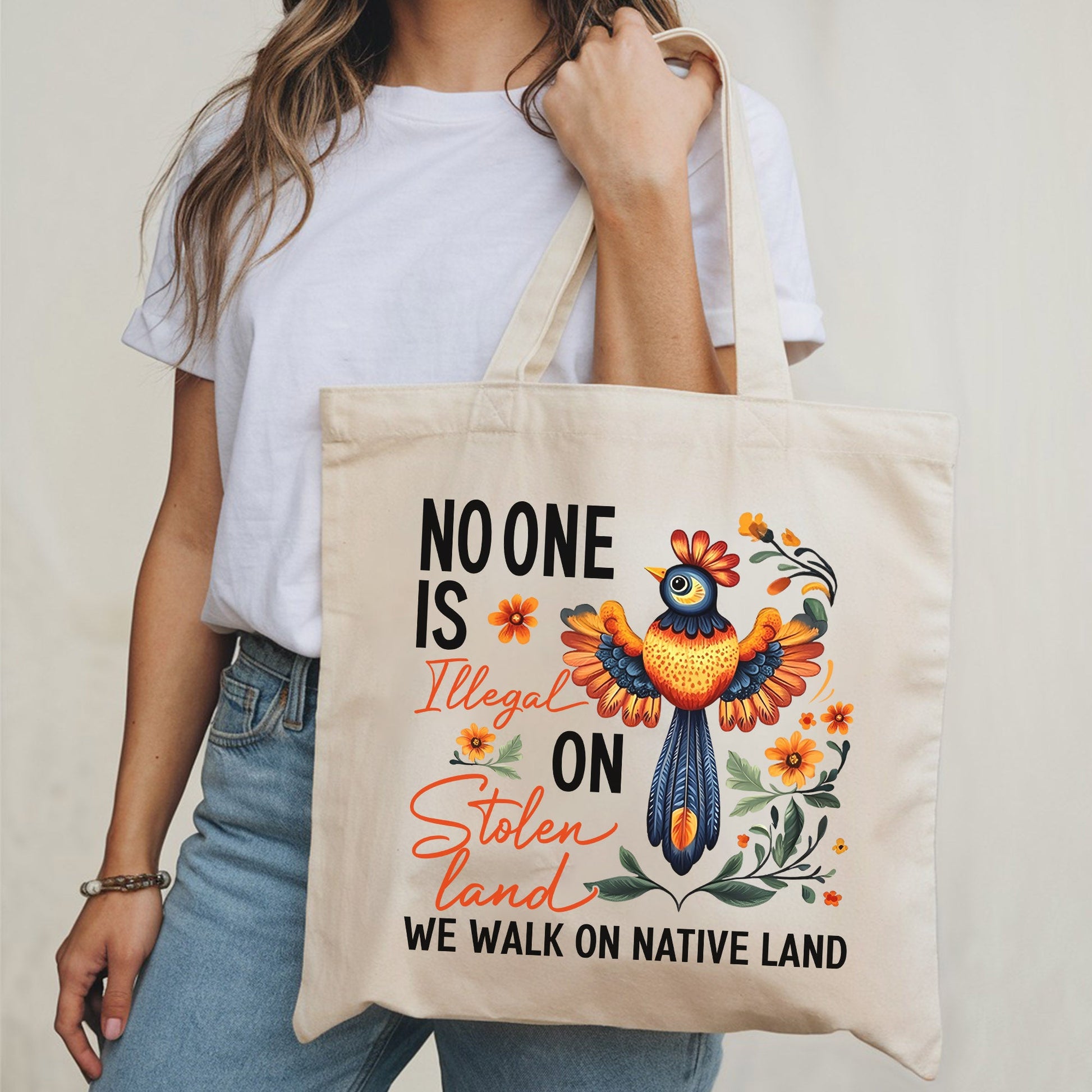 Show your support for a powerful message with our "No One Is Illegal On Stolen Land" tote bag. This vibrant and durable bag features a beautiful design with a colorful bird and floral patterns, making it a statement piece that also promotes unity and awareness for Native lands.