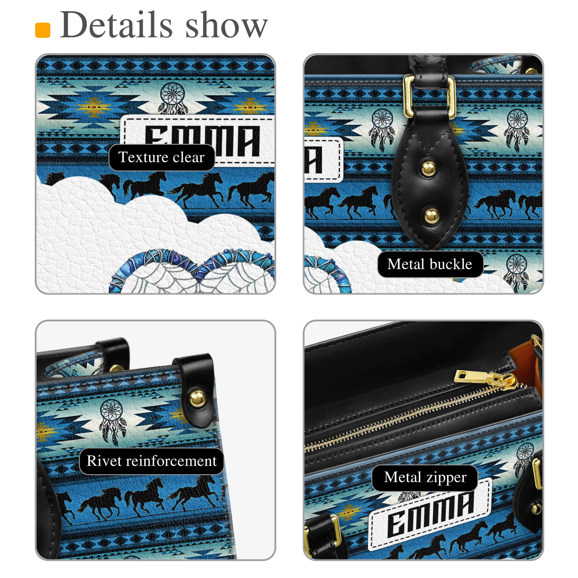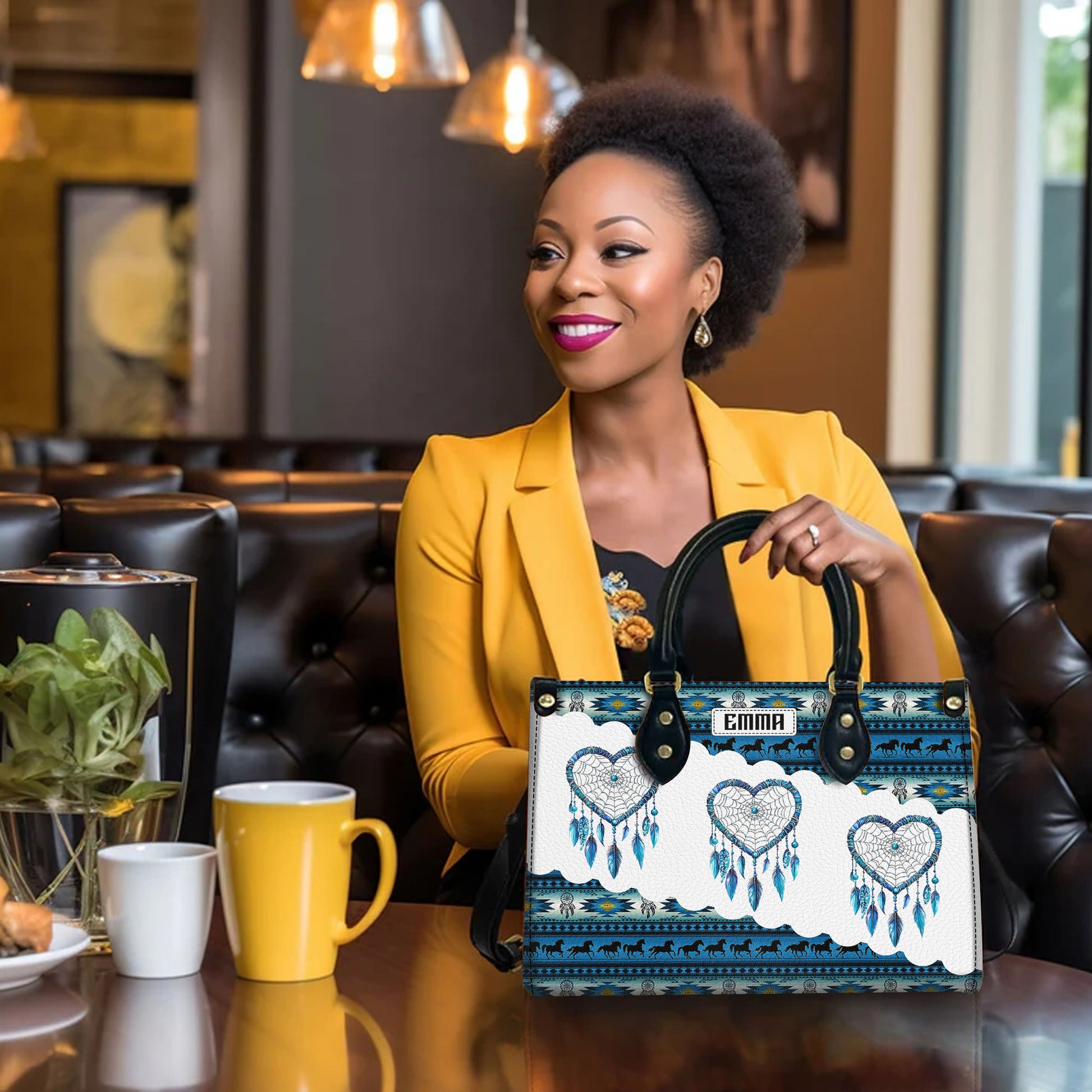 Personalized Leather Handbag for Women - Design Patterns Boho Blue & White Dreamcatcher