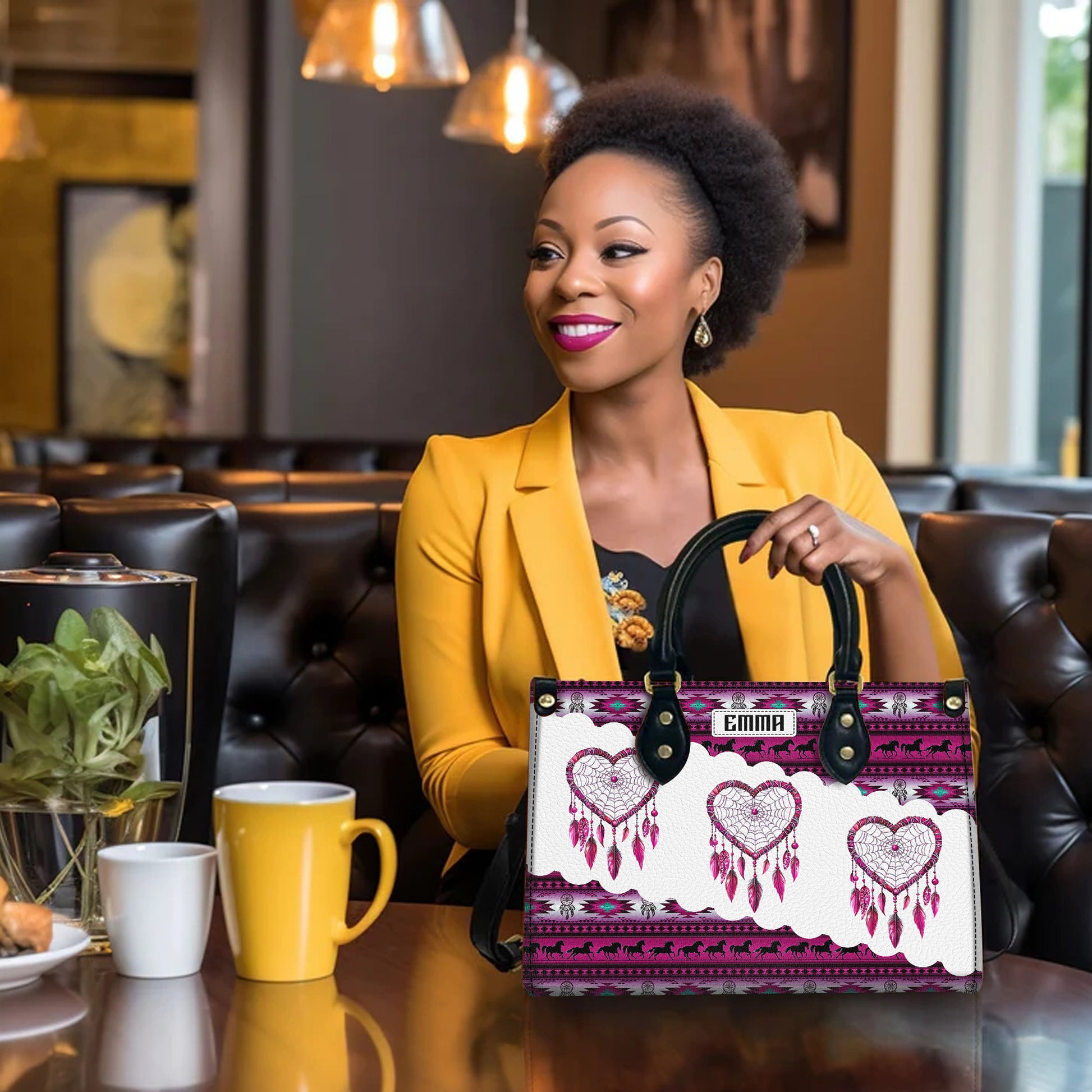 Personalized Leather Handbag for Women - Design Patterns Boho Pink & White Dreamcatcher