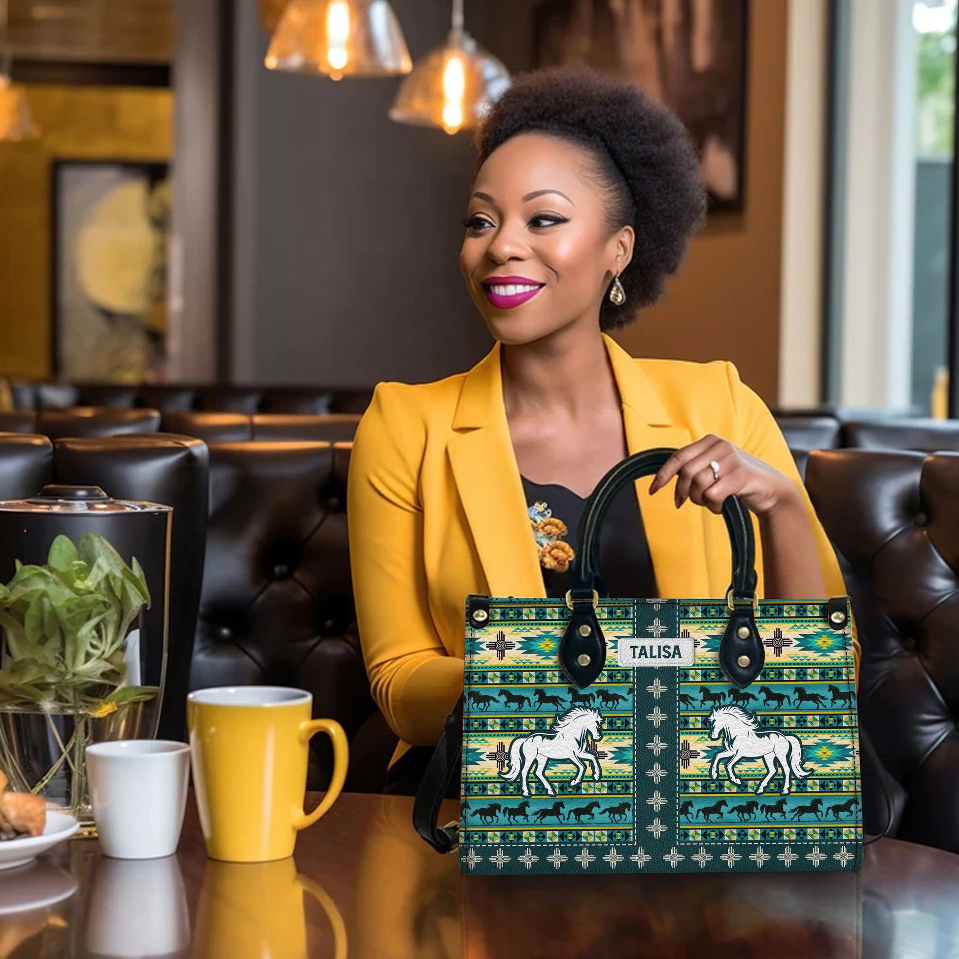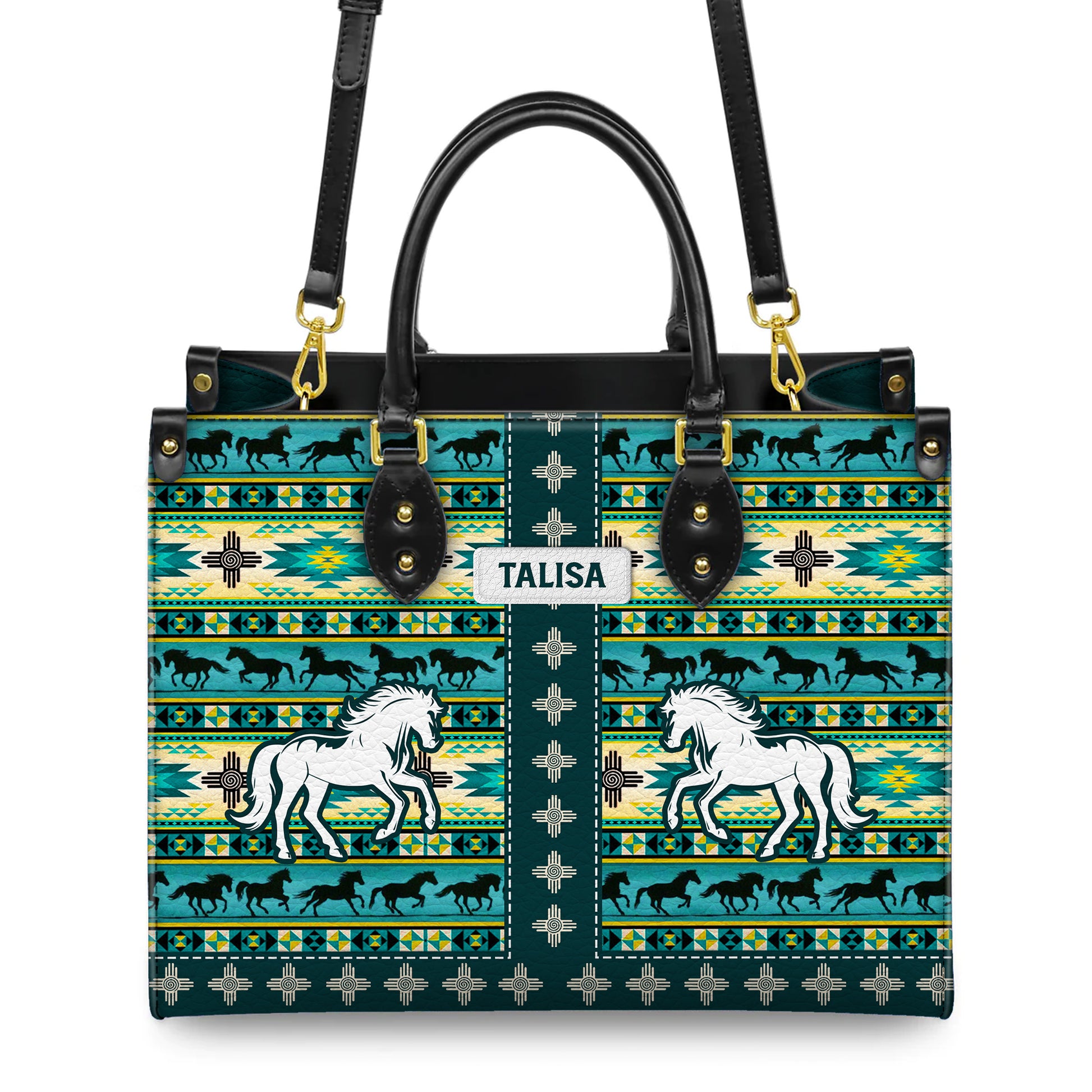 Personalized Leather Handbag for Women - Design Patterns Boho Native Spirit Galloping Horse