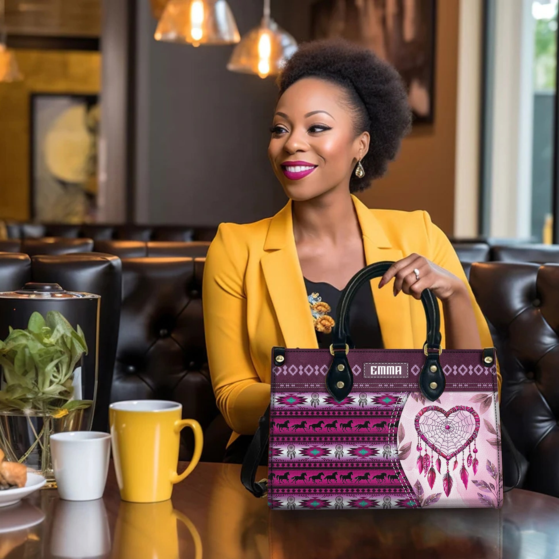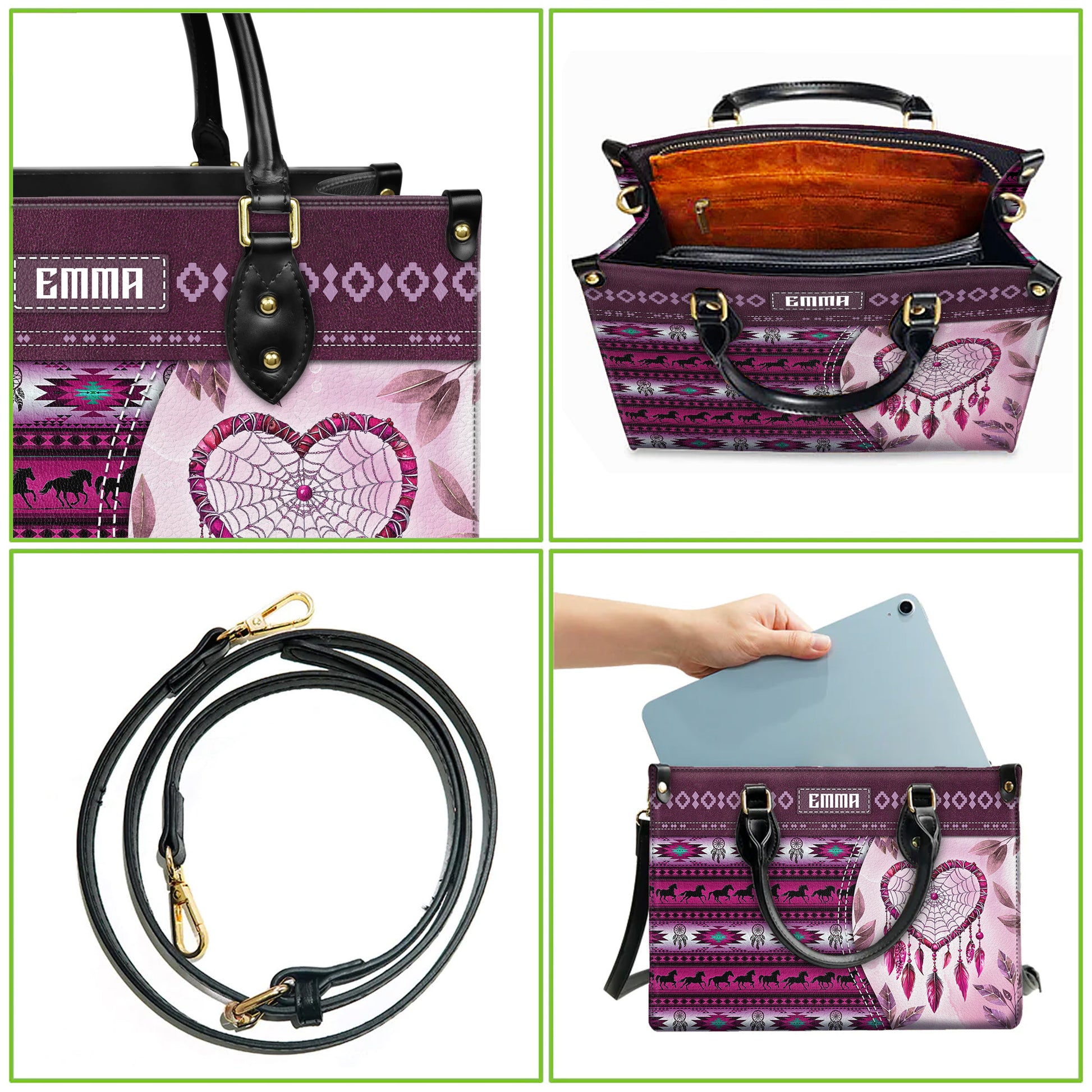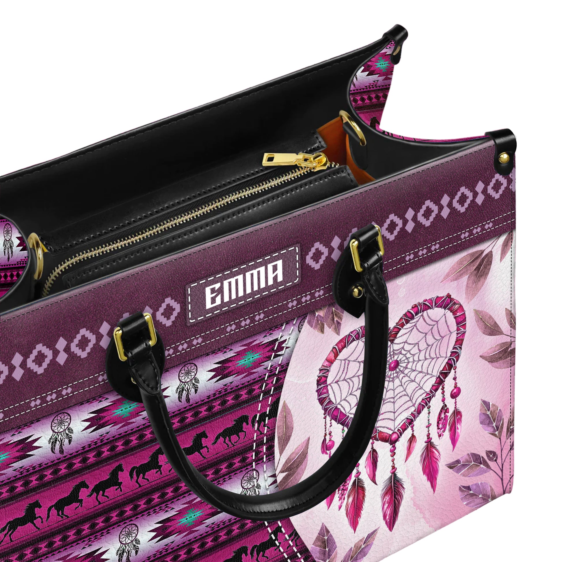 Personalized Leather Handbag for Women - Design Patterns Boho Pink Dreamcatcher